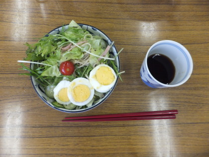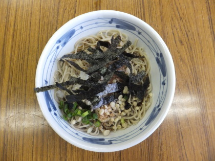 メニューはピエトロのドレッシングを使った蕎麦サラダ(レタス、キュウリ、水菜、カ イワレ、ミニトマト、茹で卵、ハム)、もり蕎麦、おろし蕎麦(ネギ、大根おろし、モミ海苔、天かす、すりごま)、蕎麦がきゼンザイ、蕎麦ツユの材料で作った佃煮。