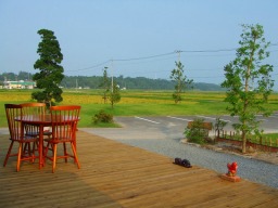 大きなウッドデッキが温もりを感じさせるお宿でしたが、2年ぶりで戻ったその姿は、さらにウッドデッキがバーベキューを楽しんだお庭にまで伸びて、すごいことになっていました。手入れが大変だろうなあーって、要らぬお世話ですね。打ち水がしっかりされていて、わざわざ濡らしていいのだろうかと、これも要らぬ心配。